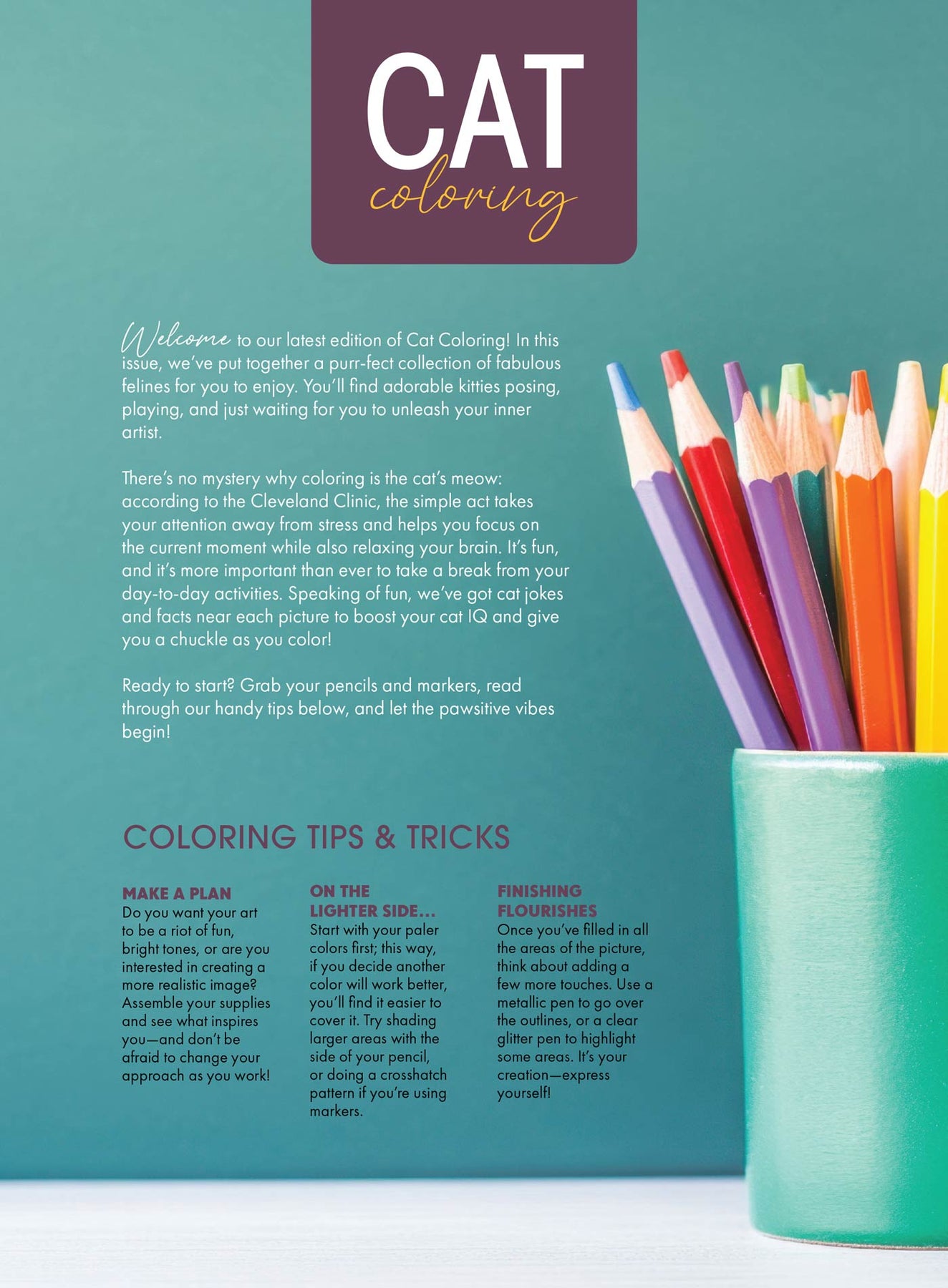 There's no mystery why coloring is the cat's meow: according to the Cleveland Clinic, the simple act takes your attention away from stress and helps you focus on the current moment while also relaxing your brain. It's fun, and it's more important than ever to take a break from your day-to-day activities. In this issue, we've put together a purr-fect collection of fabulous felines for you to enjoy. You'll find adorable kitties sleeping, playing and posing - and just waiting for you to unleash your inner artist. magically comes to life as you color it in and—once completed— will bring enjoyment to your life.