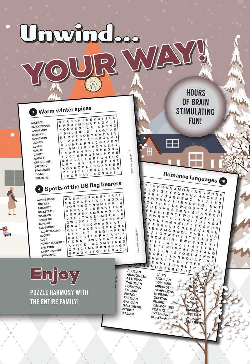 Discover Puzzle Harmony's Winter Special word search book! Our beautifully designed, winter-themed full-sized book is perfect for relaxing, unwinding, and de-stressing. Sit back and solve as you immerse yourself in the joy of word searches this season—your ultimate source for fun and relaxation awaits!