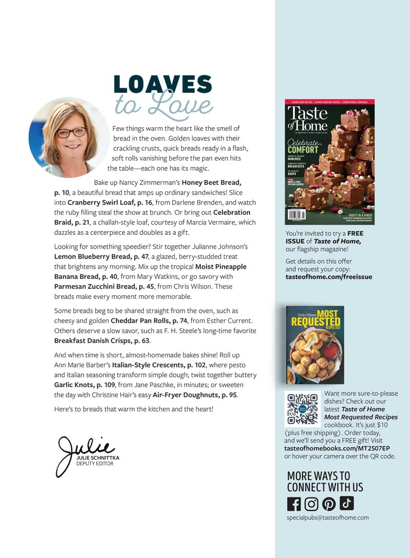 Discover the ultimate baking guide with Taste of Home: Over 100 Bread Recipes and Tips for Baking Success! Whether you're perfecting a simple sourdough starter, crafting rustic loaves, or whipping up quick breads and bakery-fresh muffins, this collection ensures every bite is a delight. Elevate your kitchen skills and impress friends and family with golden rolls and more, making every loaf a masterpiece!
