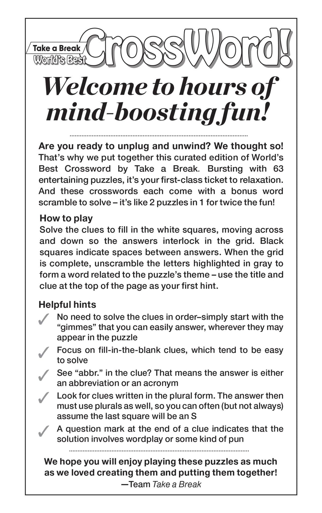 Take a Break with World's Best Puzzles- Cross Word! This large print, new edition includes over 99 puzzles & mystery words! Enjoy hours of mind-boosting fun!