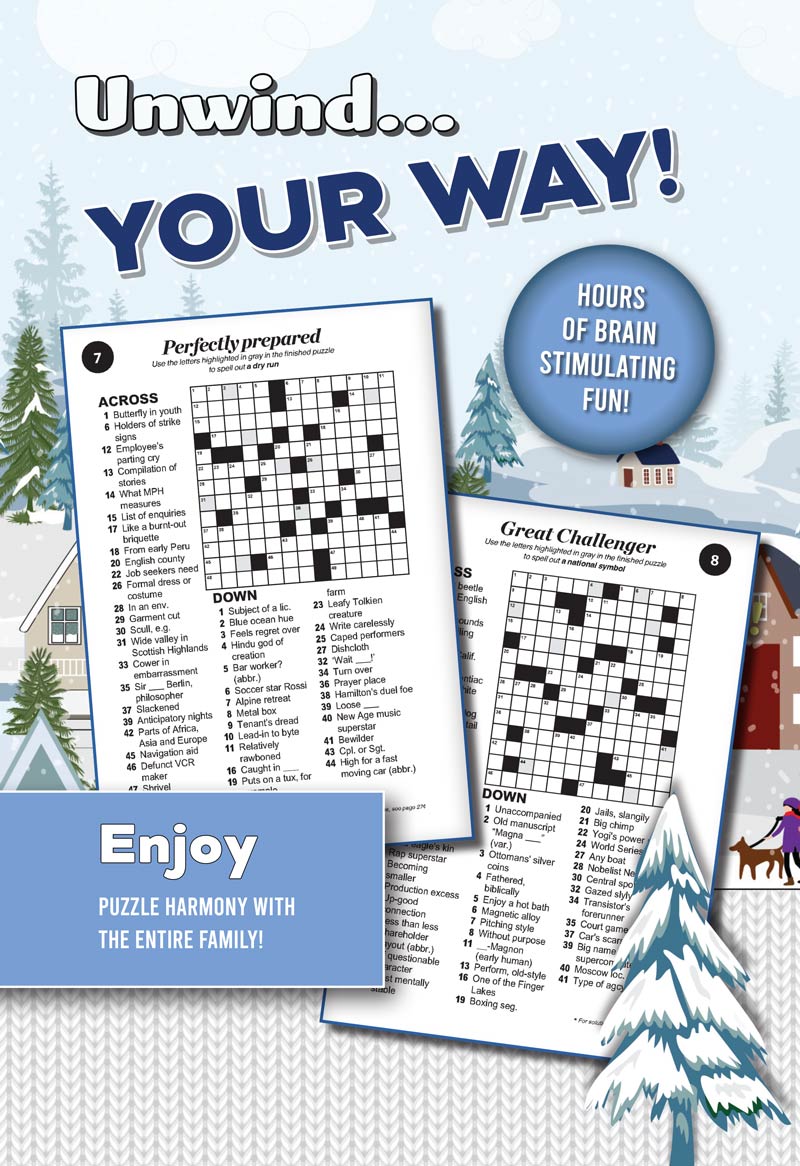 Discover Puzzle Harmony's Winter Special crossword book! Our beautifully designed, winter-themed full-sized book is perfect for relaxing, unwinding, and de-stressing. Sit back and solve as you immerse yourself in the joy of crosswords this season—your ultimate source for fun and relaxation awaits!