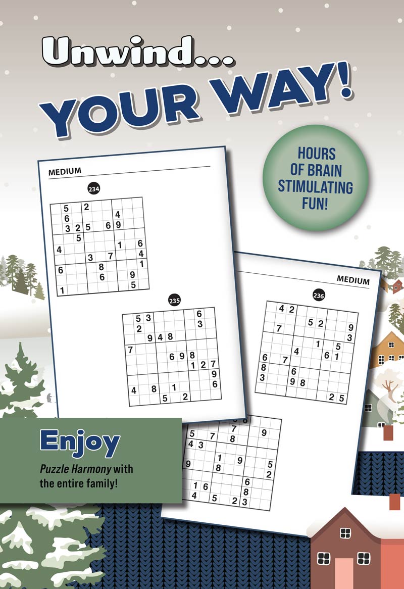 Discover Puzzle Harmony's Winter Special, featuring sudoku puzzles! Our beautifully designed, winter-themed full-sized book is perfect for relaxing, unwinding, and de-stressing. Sit back and solve as you immerse yourself in the joy of sudoku puzzles this season—your ultimate source for fun and relaxation awaits!