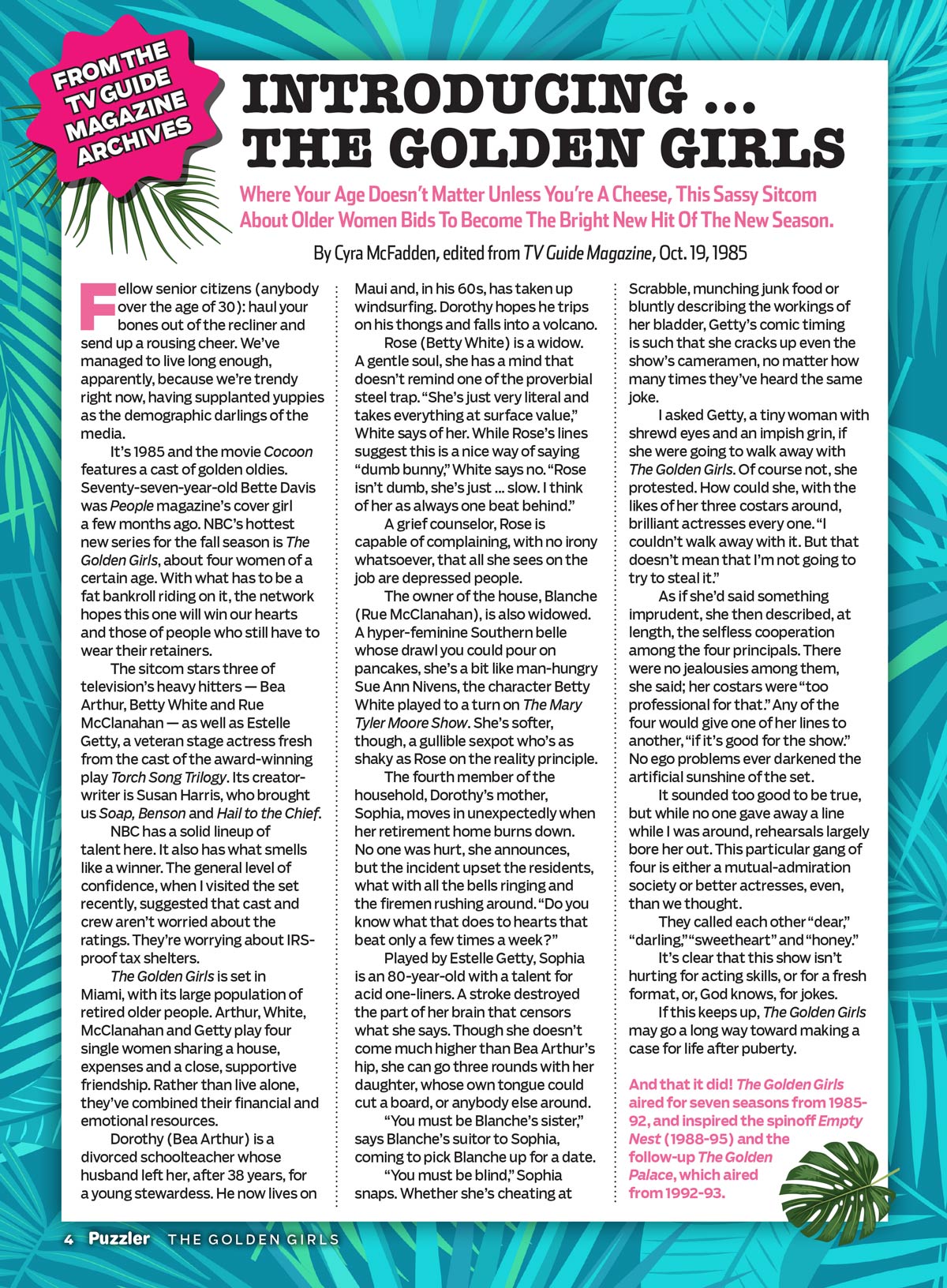 Celebrate the 40th anniversary of the iconic TV show with our special edition of TV Guide: The Golden Girls Puzzler! This fun-packed issue is brimming with engaging activities including crosswords, word sudoku, spot the difference, trivia, and more, perfect for fans of all ages. Dive into the world of Blanche, Rose, Dorothy, and Sophia as you challenge your mind and relive the magic of this beloved series!