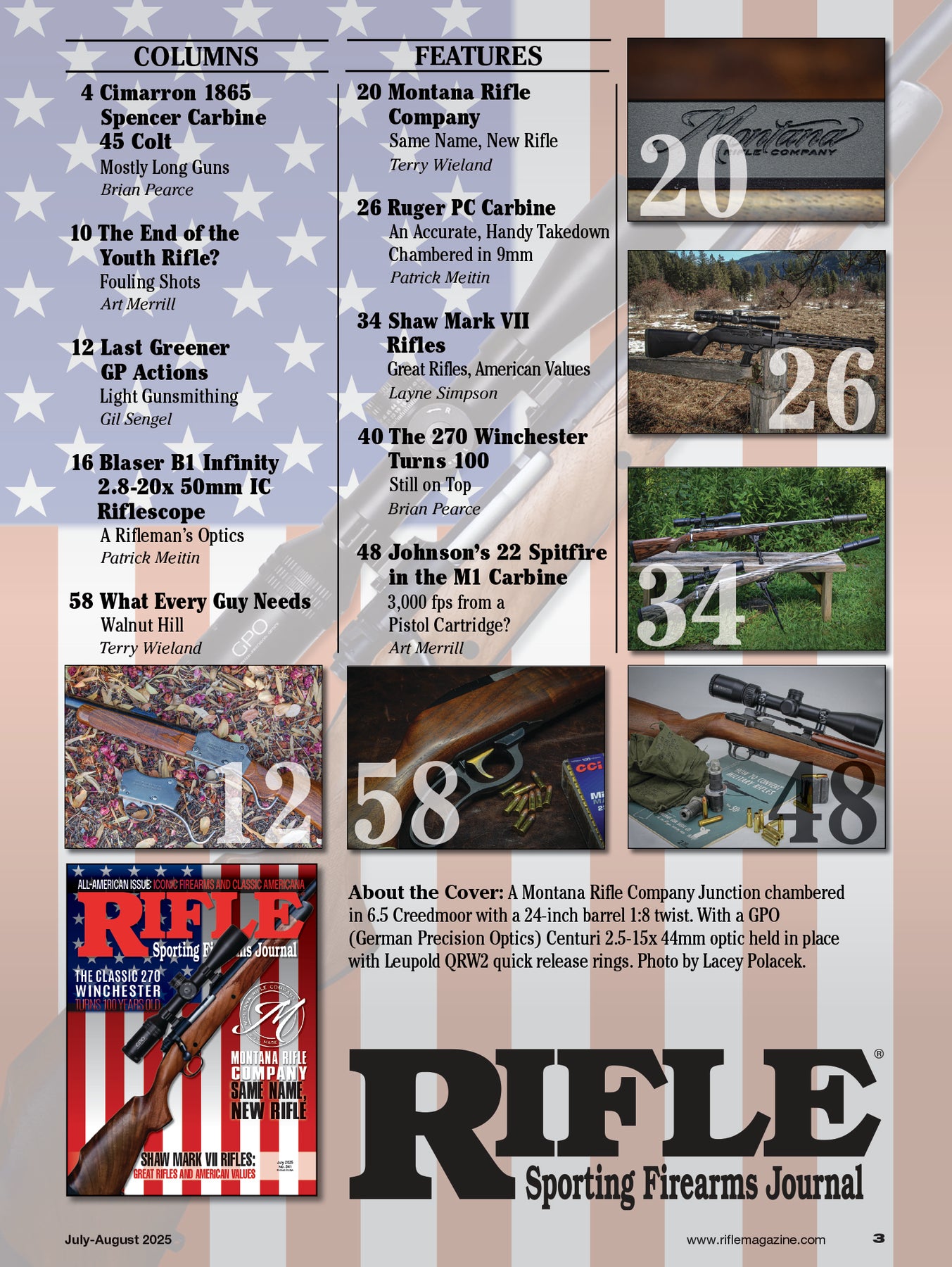Rifle, The Sporting Firearms Journal is the only magazine in the world dedicated solely to rifles. Rifle magazine covers rifles from the 1800’s to modern rifles and from the smallest calibers to the largest. Rifle provides information on new rifles and how they functioned through our rigorous testing. Some columns include light gunsmithing, Custom Corner and optics. All columns and features have an emphasis on a particular rifle. For example, we cover rifles used in various wars, sporterized rifles, modern hunting rifles, long range rifles and much more. Even the advertising is tailored to rifles, gunsmiths and optics making the ads like a directory. Rifle magazine takes you from the loading bench to the rifle range and then the field to show how each rifle performs.