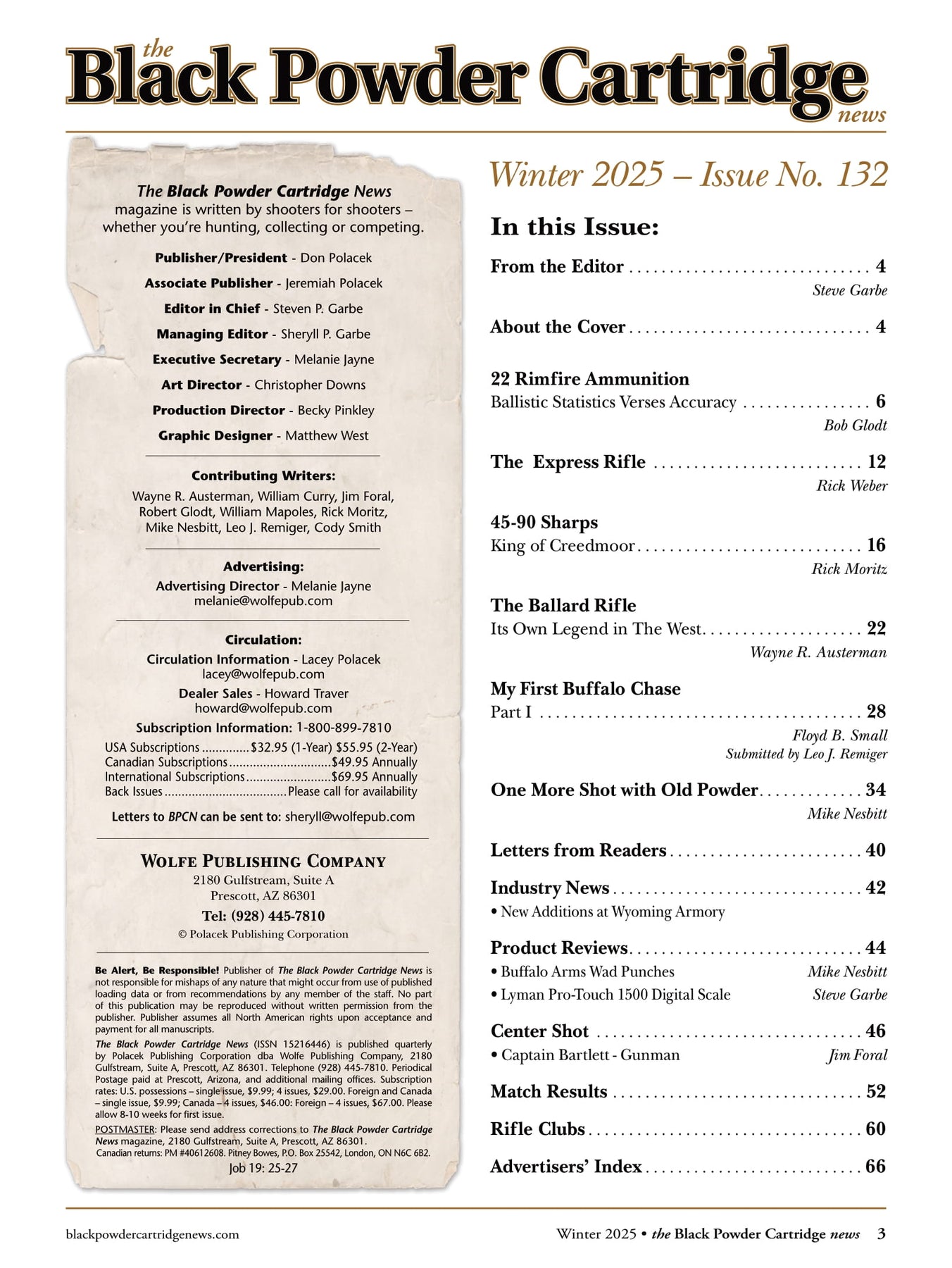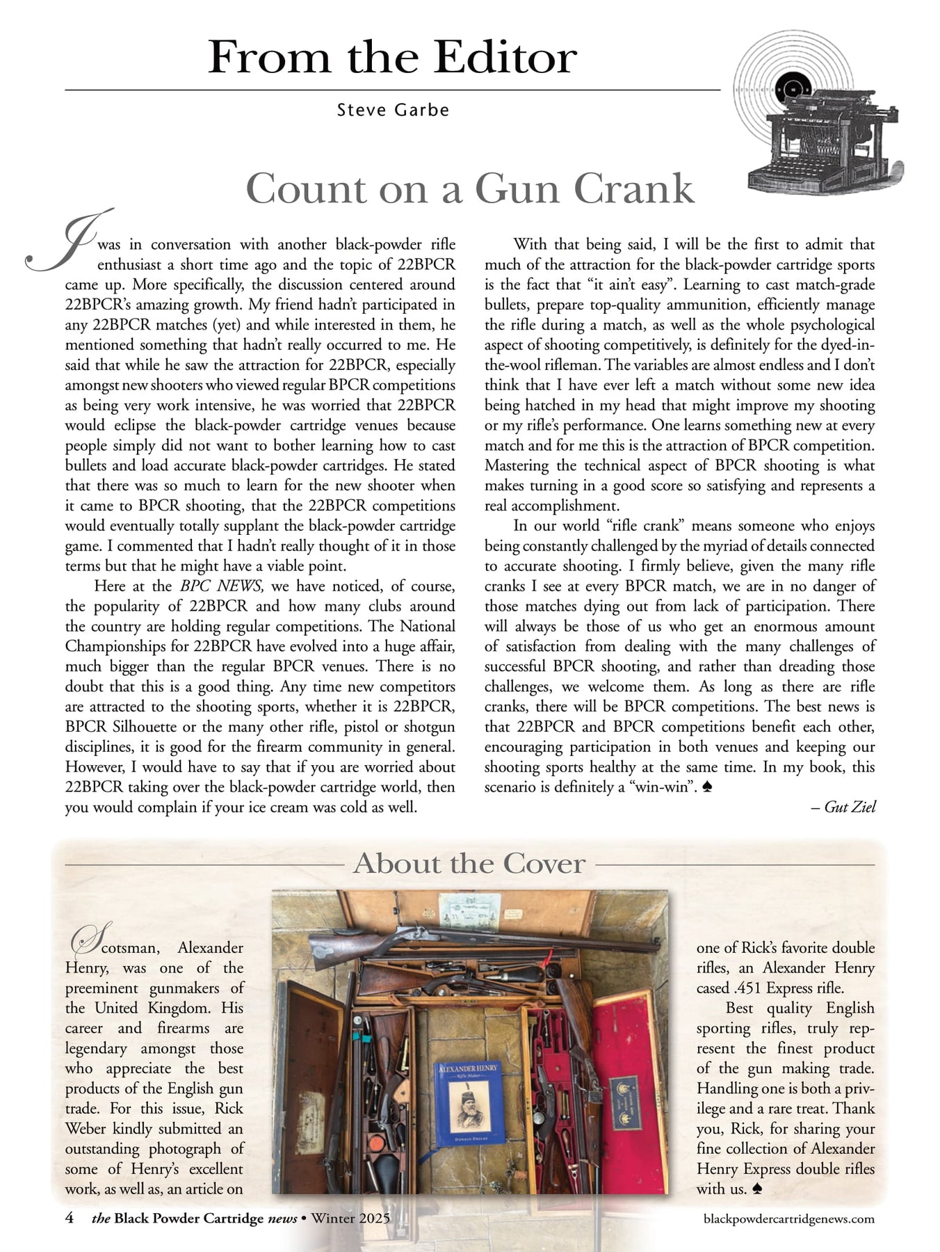 Black Powder Cartridge News covers the rifles and handguns of yesteryear. The guns that won the west and more. From the time the first muzzleloading rifle was transformed into a self-contained cartridge rifle, black powder was the propellant used. Many of these older firearms cannot use modern smokeless propellant. This magazine covers the rifles and handguns of the black powder era. Black Powder Cartridge News covers historical facts from battles long ago and firearms used in those battles. We cover care and usage of these firearms including loading information for safe shooting. There is a huge following to the Black Powder Market and each issue covers the black powder matches across the country. We share information on upcoming matches as well as the results of each match. This all makes Black Powder Cartridge News the number one source of information on everything Black Powder.