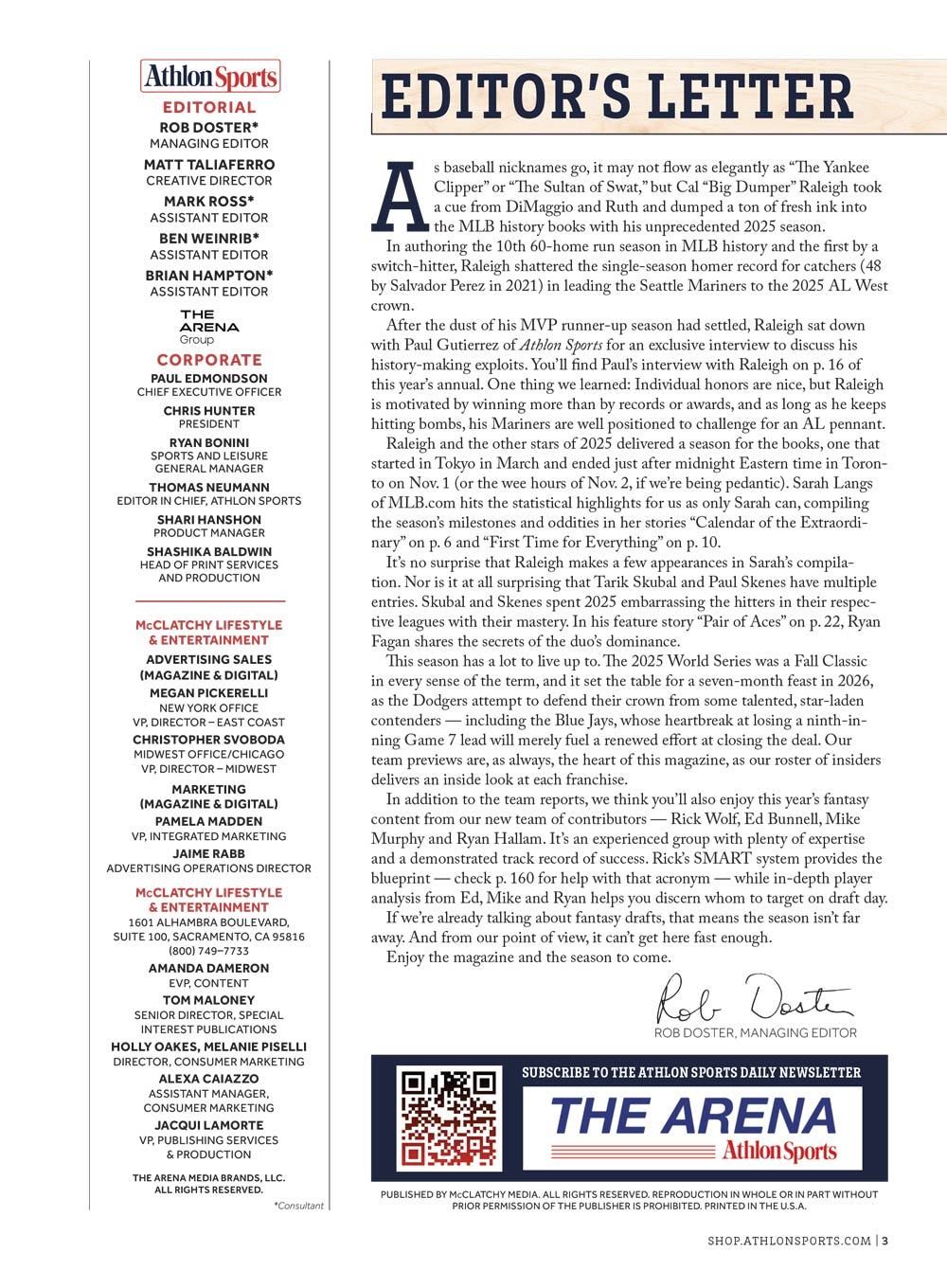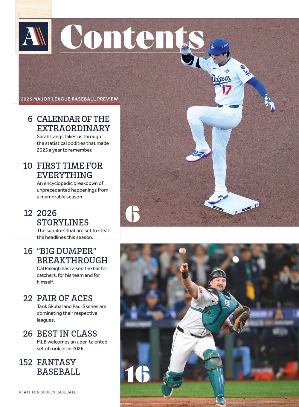 Athlon Sports’ 2026 Major League Baseball Preview delivers a complete breakdown of all 30 MLB teams, featuring in-depth analysis of the upcoming season and the league’s biggest storylines. Highlights include an exclusive interview with Cal Raleigh, star coverage of Shohei Ohtani, Aaron Judge, Ronald Acuña Jr., Paul Skenes, Tarik Skubal, and more of baseball’s top talent. Packed with a dedicated fantasy baseball section, top prospects, and expert insights, this must-read issue is the ultimate guide for MLB fans and fantasy players alike.