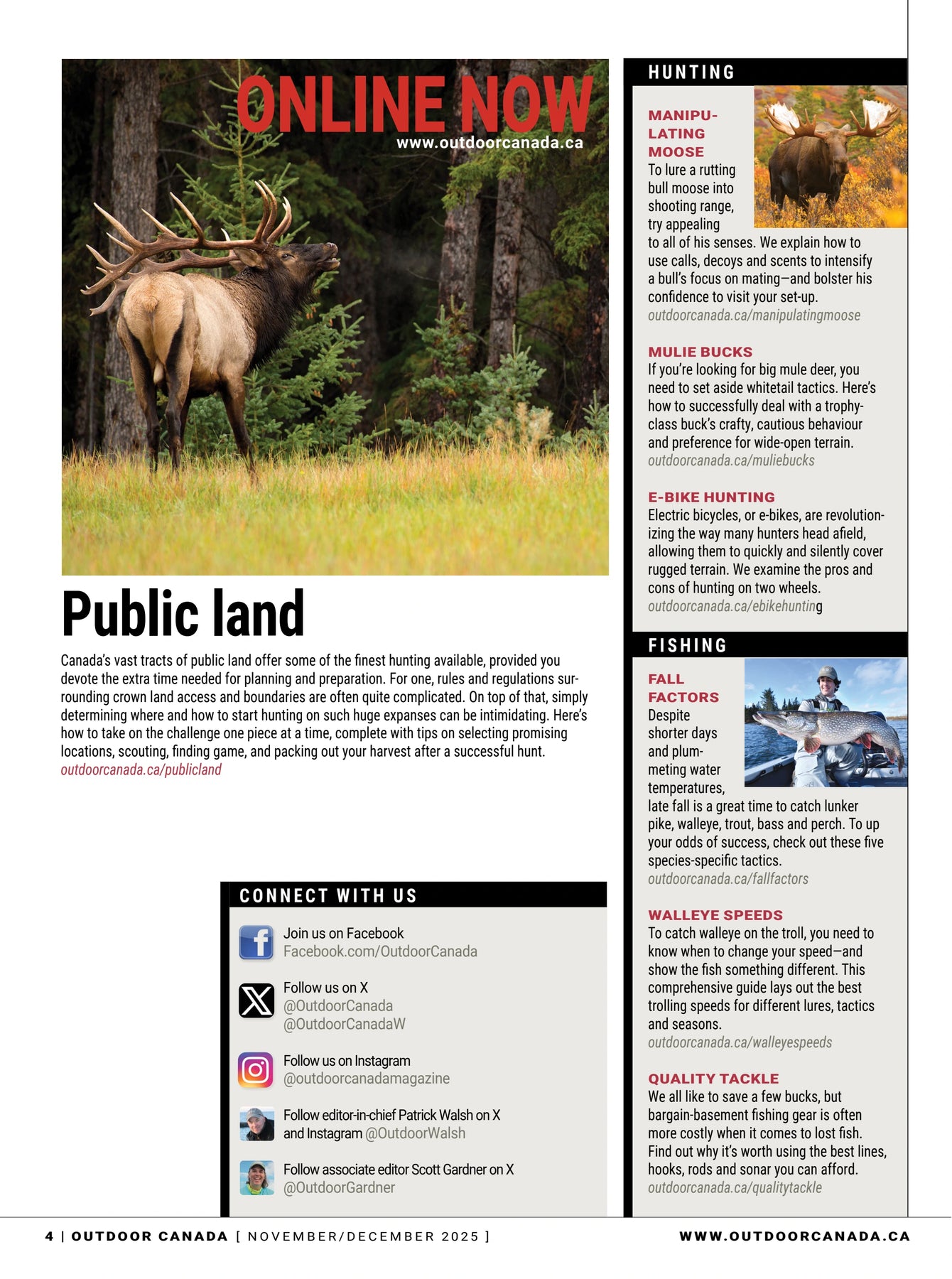 As Canada’s only national fishing and hunting magazine, Outdoor Canada has been entertaining and informing readers since 1972 with a lively mix of how-to articles, buyer’s guides, profiles, travelogues, in-depth reportage and expert analysis.