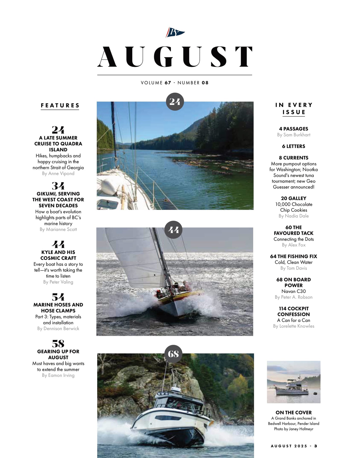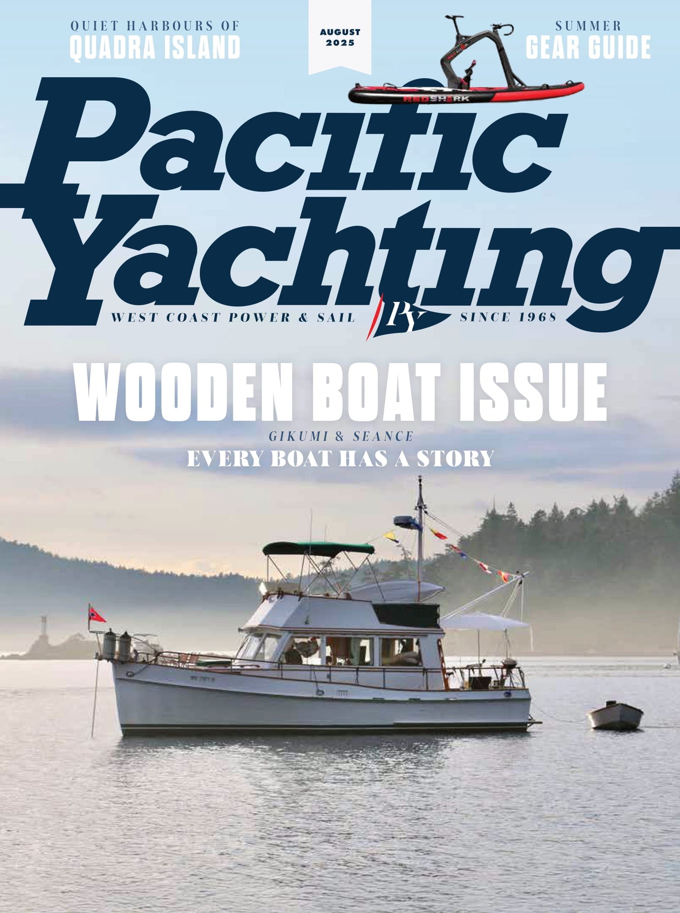 Pacific Yachting - August 2025: Wooden Boat Issue, Every Boat Has A Story, Gikumi & Seance, Quiet Harbours Of Quadra Island, Marine Hoses & Clamps, Summer Gear Guide & More!