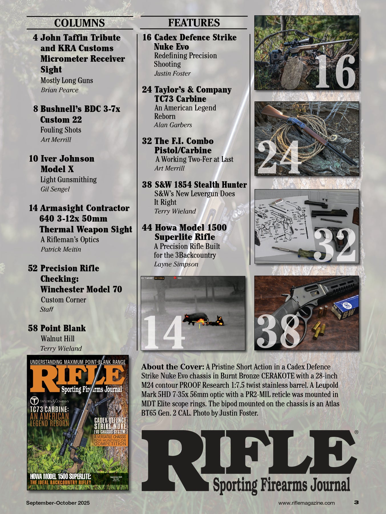 Rifle, The Sporting Firearms Journal is the only magazine in the world dedicated solely to rifles. Rifle magazine covers rifles from the 1800’s to modern rifles and from the smallest calibers to the largest. Rifle provides information on new rifles and how they functioned through our rigorous testing. Some columns include light gunsmithing, Custom Corner and optics. All columns and features have an emphasis on a particular rifle. For example, we cover rifles used in various wars, sporterized rifles, modern hunting rifles, long range rifles and much more. Even the advertising is tailored to rifles, gunsmiths and optics making the ads like a directory. Rifle magazine takes you from the loading bench to the rifle range and then the field to show how each rifle performs.